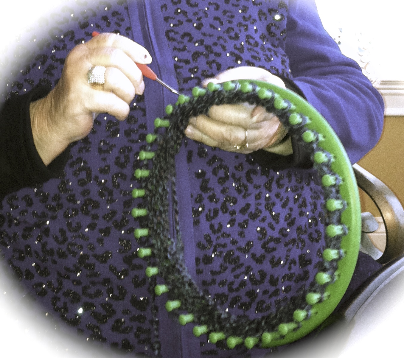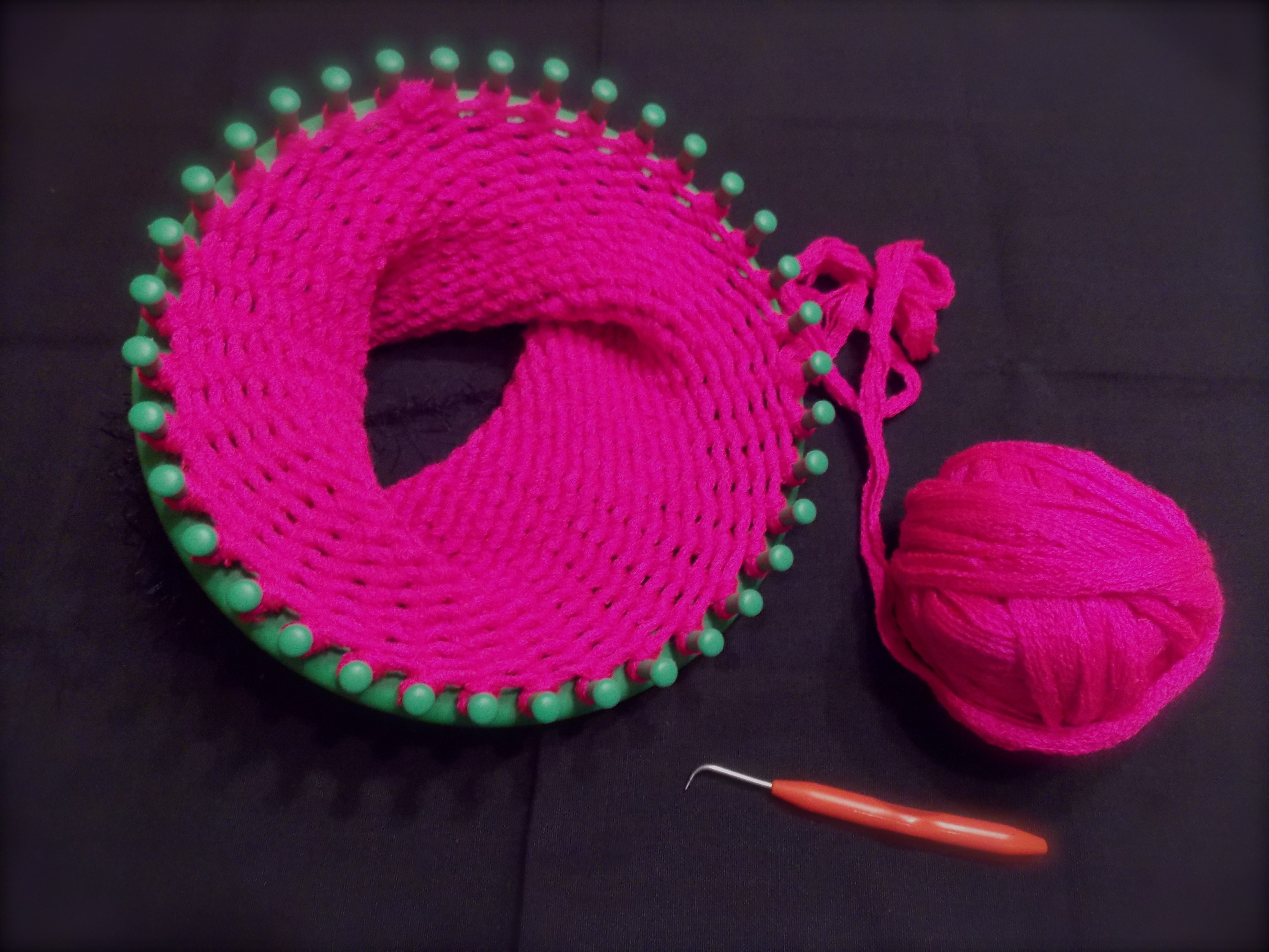 - Thick, Chunky Yarns (but not too thick) – Lion Brand has a Hometown USA label that has nice bright colors. For you advanced loomers, I just do a regular “e-wrap” stitch when I use these yarns or they become too dense.
