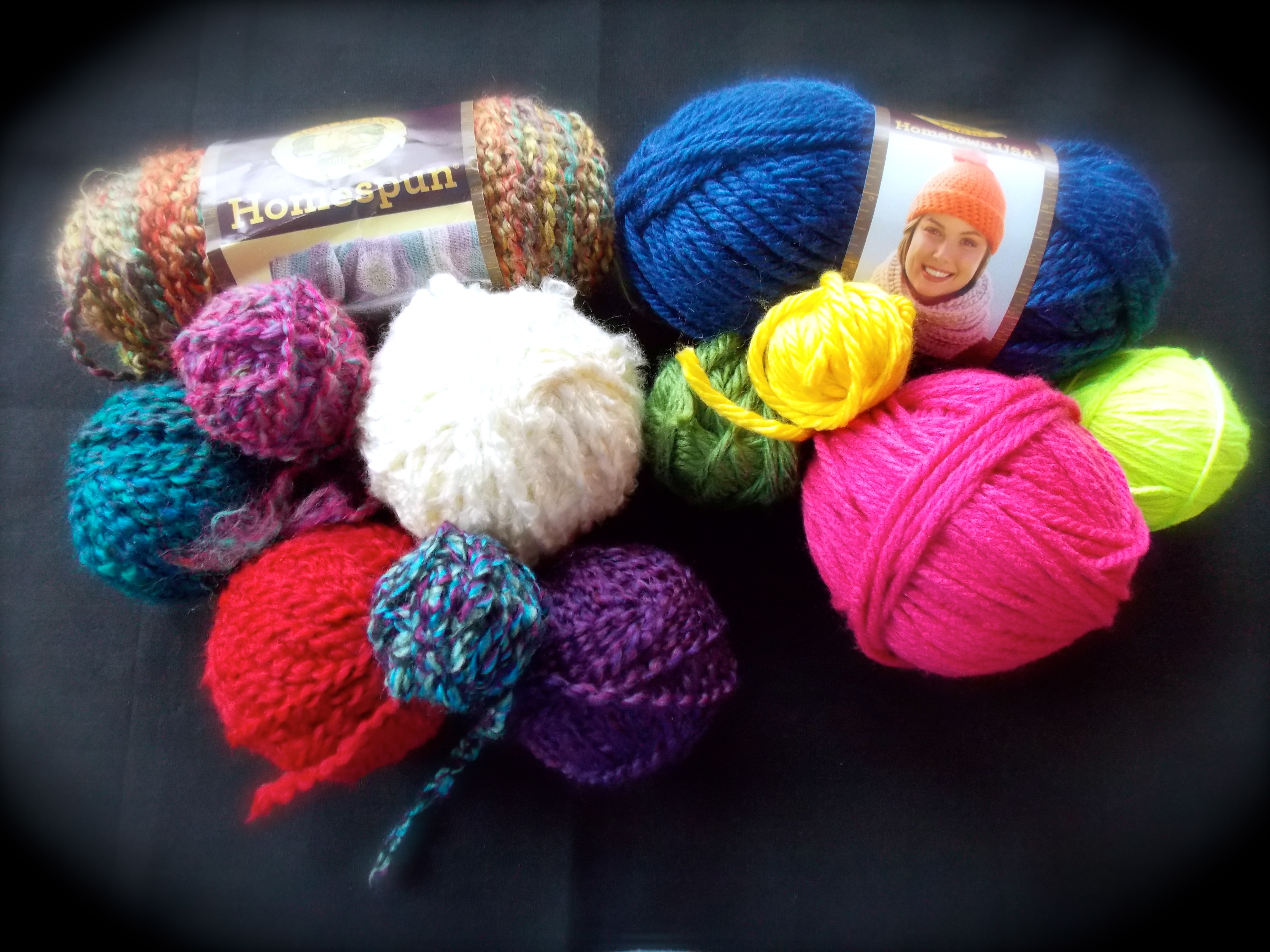 - Spun Yarns – I like the texture of these yarns for loom-knitting a cap. I’ve found 2 brands that I use a lot. Lion Brand’s Homespun and Loops & Threads’ Country Loom Yarn. Both work great and both come in variegated colors, which makes the caps interesting with less work for you!