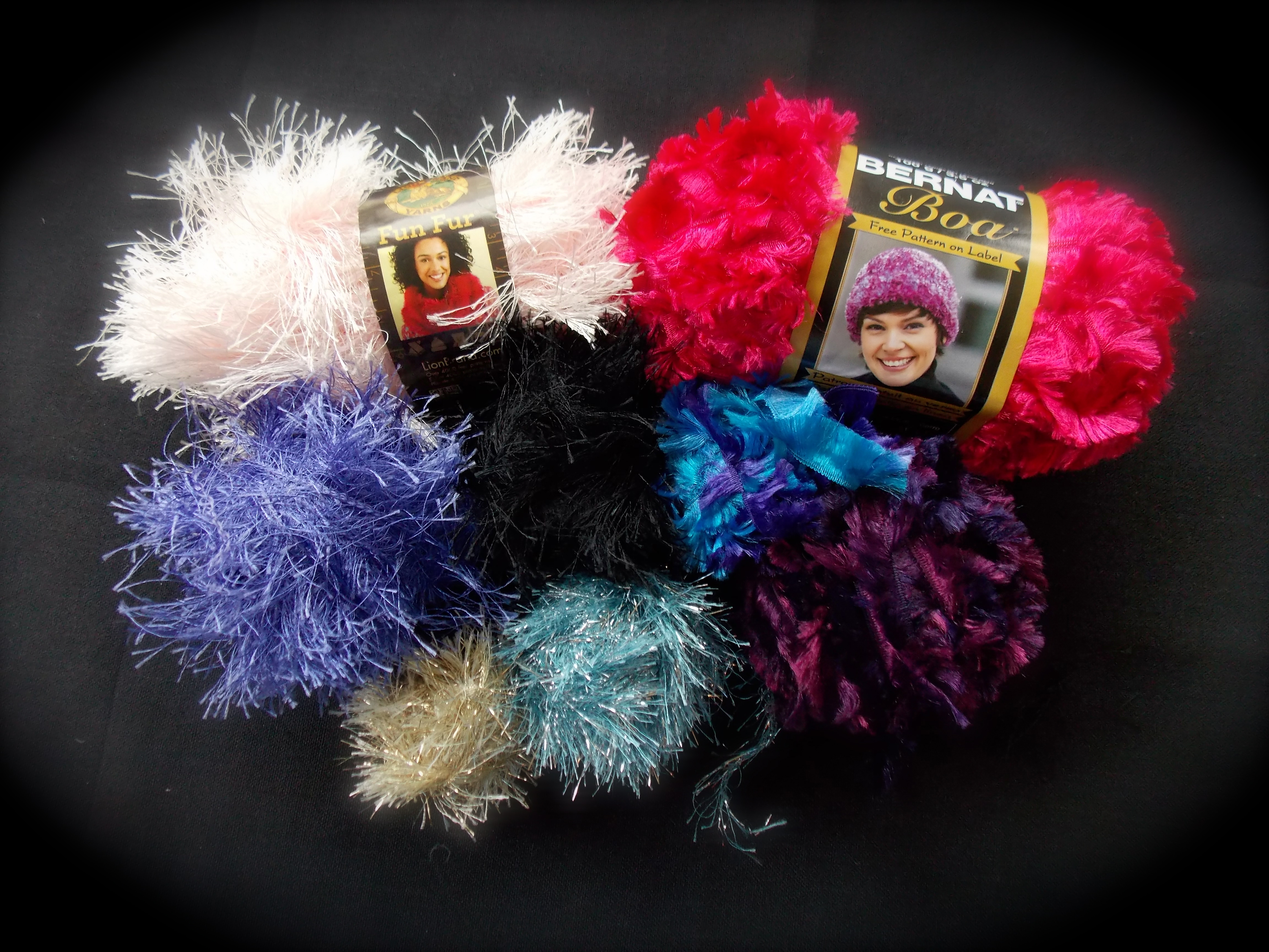 - Fun Fur – Lion Brand’s Fun Fur is not as glittery, and a bit longer than the eyelash. I love the super soft, fun texture it gives to caps.